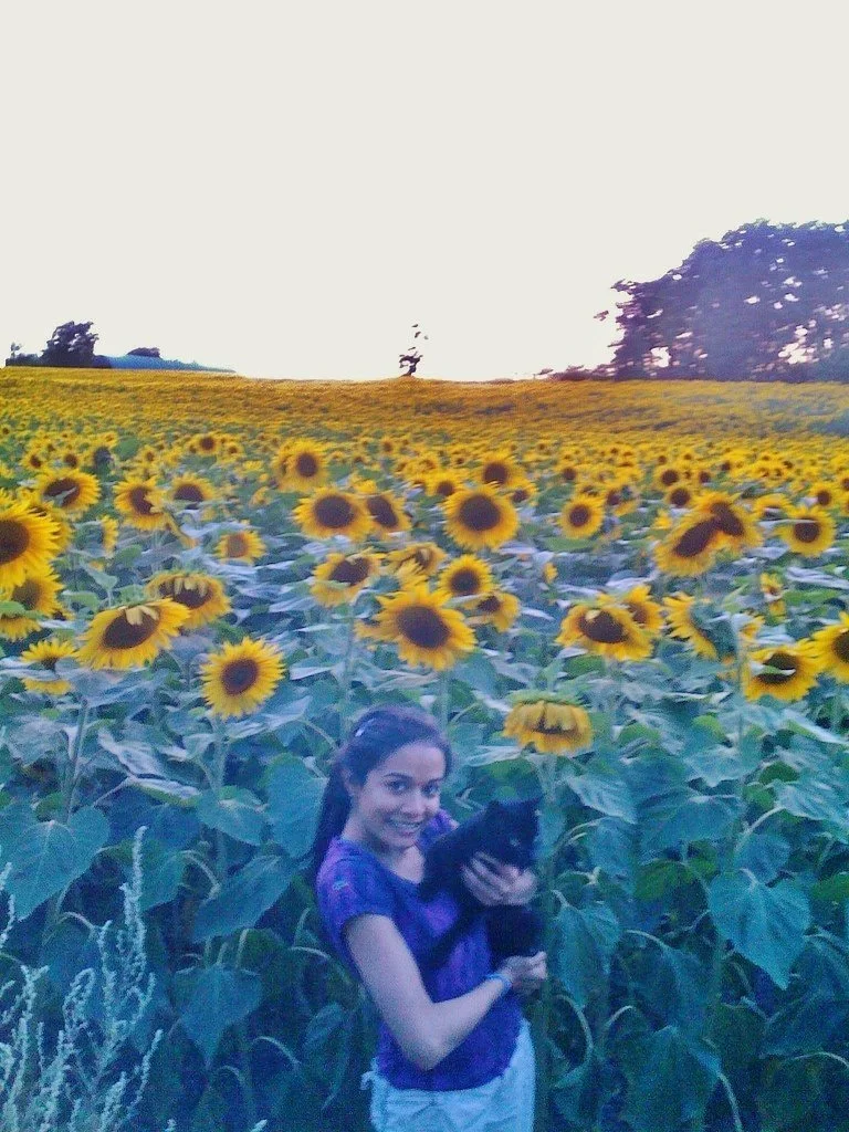 Sunflower field in Geneva, Switzerland, where a little black cat would follow me as my self-appointed chaperone.